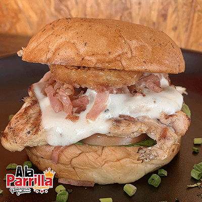 Pan de hamburguesa artesanal, verduras, queso mozzarella, pechuga de pollo, tocineta, aro de cebolla y salsas de la casa.