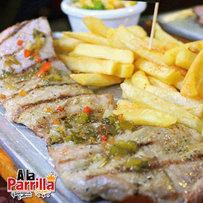 Lomo de cerdo a la parrilla con chimichurri argentino, acompañado de nuestra salsa de la casa.