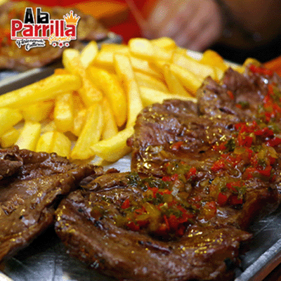 Lomo de res a la parrilla y grille (pimentón y cebolla), en juliana salteados con chimichurri argentino, acompañado de nuestra salsa de la casa.
