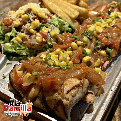 Lomo de cerdo a la parrilla con chimichurri argentino coronado con un delicioso guiso criollo y maíz dulce desgranado, acompañado de nuestra salsa de la casa.