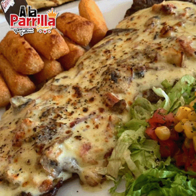 Lomo de res a la parrilla con chimichurri argentino coronado con un delicioso guiso criollo y queso parmesano, acompañado de nuestra salsa de la casa.