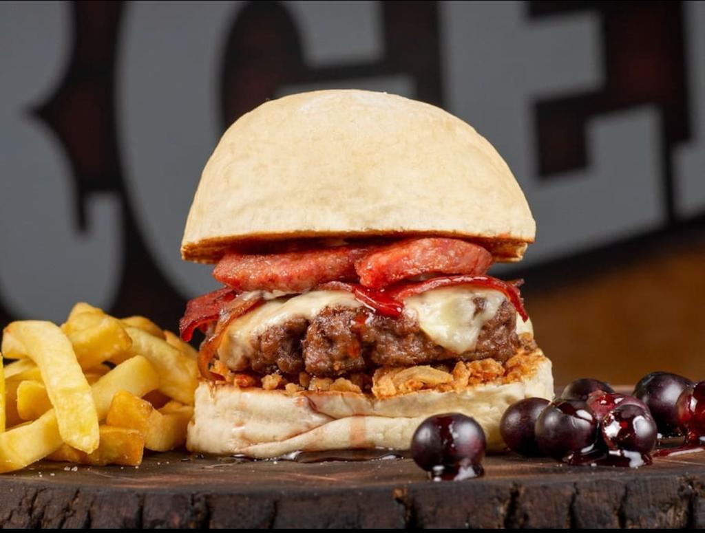 Pan tipo brioche, 250 g de carne, doble queso mozzarella, jamón ahumado, aros de cebolla crocantes, vegetales frescos y nuestra tradicional salsa de la casa.