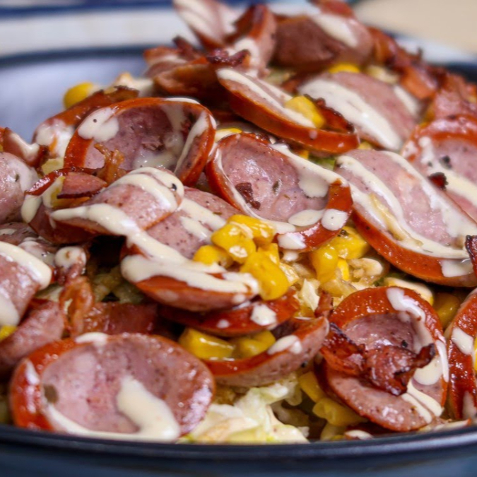 Salchicha Suiza queso maiz tierno papa chongo salsa tartara y piña