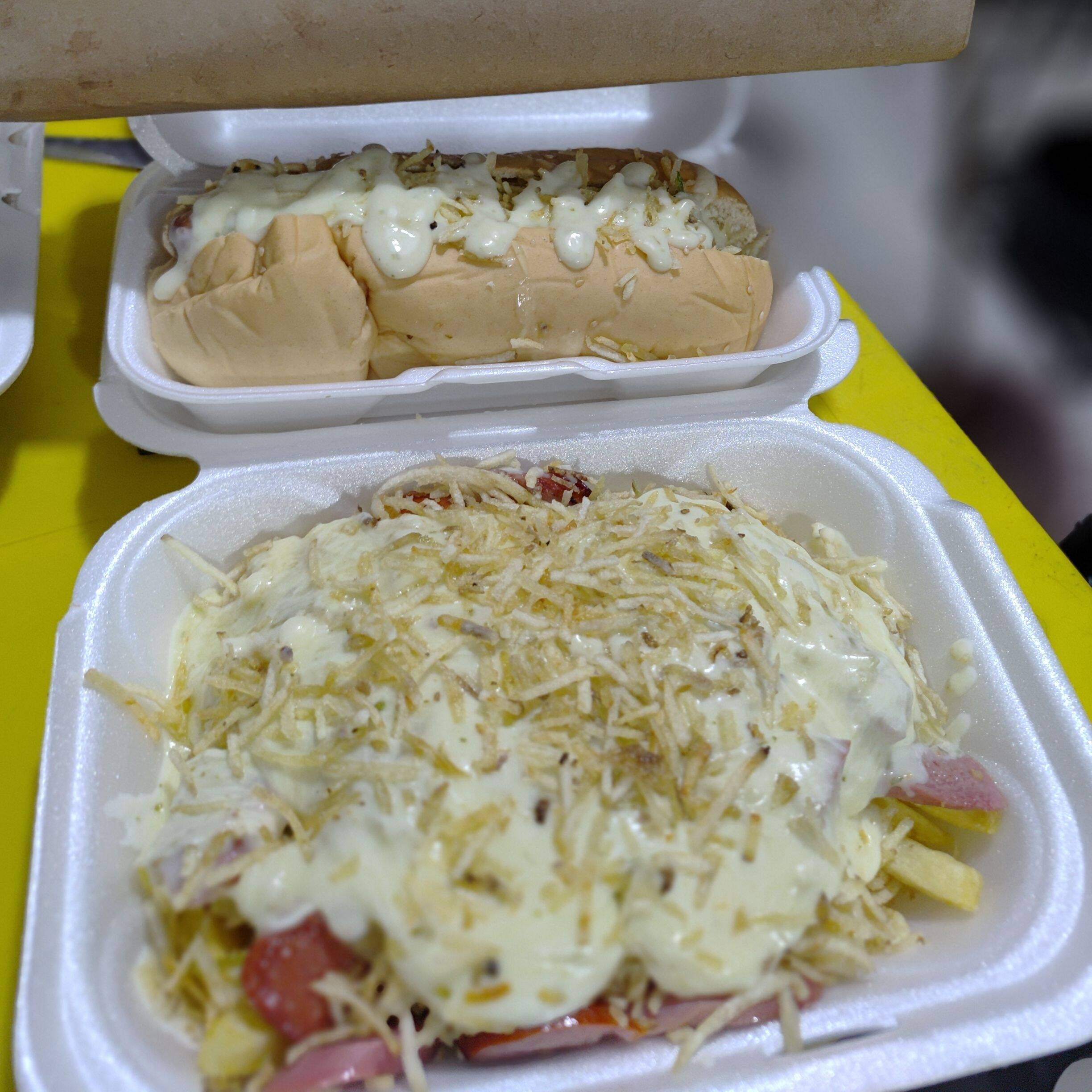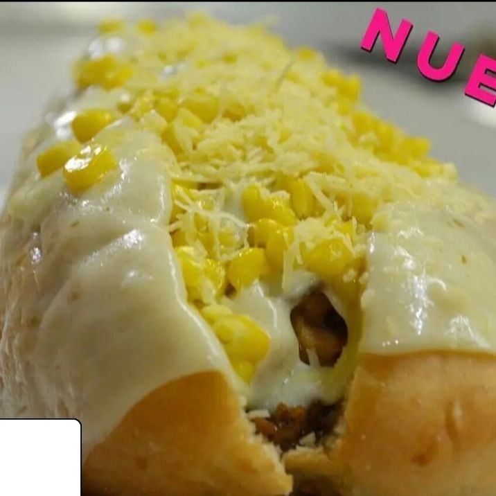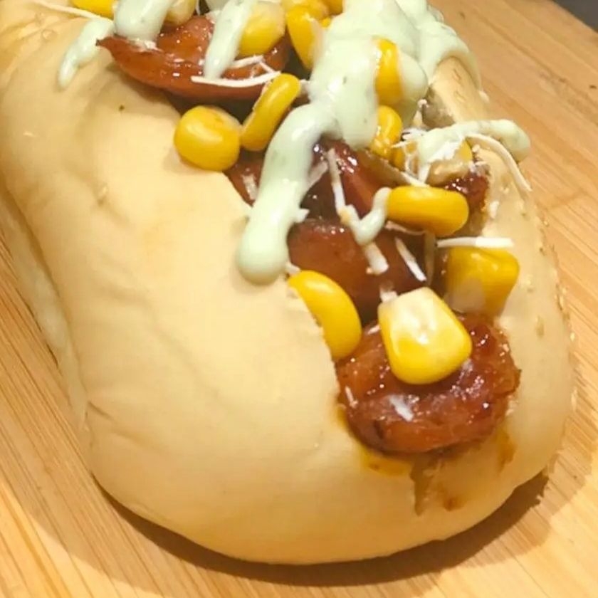 Pan, salchicha, chongo, mozarella, maiz. Tocineta y salsa de la casa