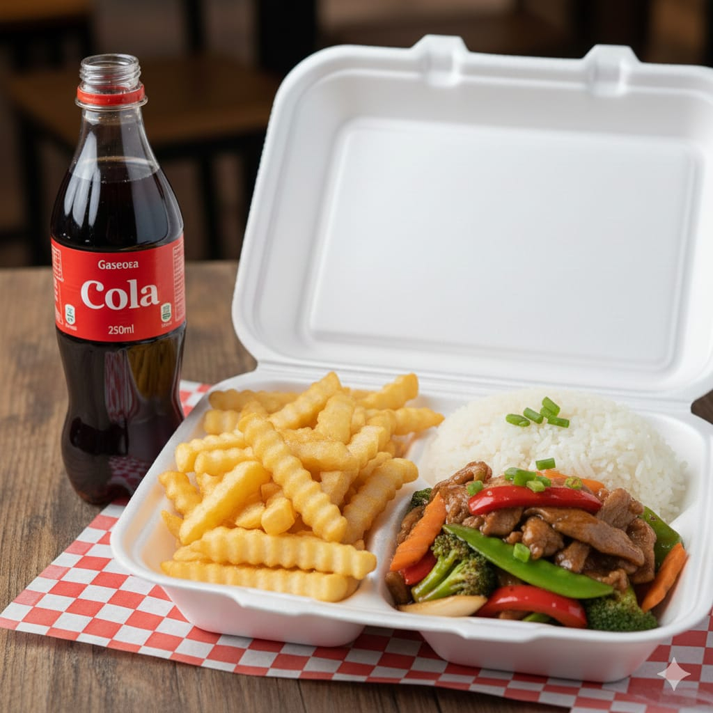 acompañado de arroz +cerdo salteado con vegetales + papas fritas+gaseosa 250 ml