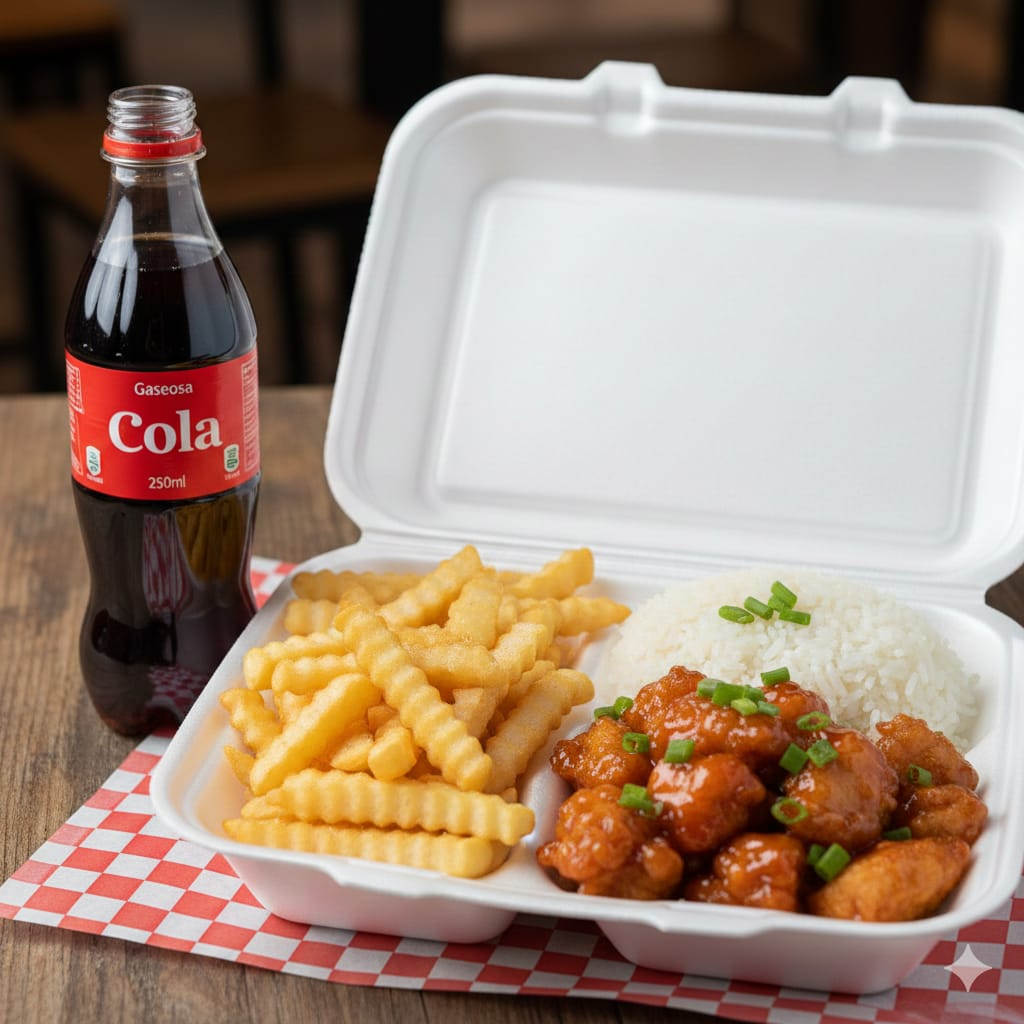 acompañado de arroz+pollo agridulce+ papas fritas+ gaseosa 250ml