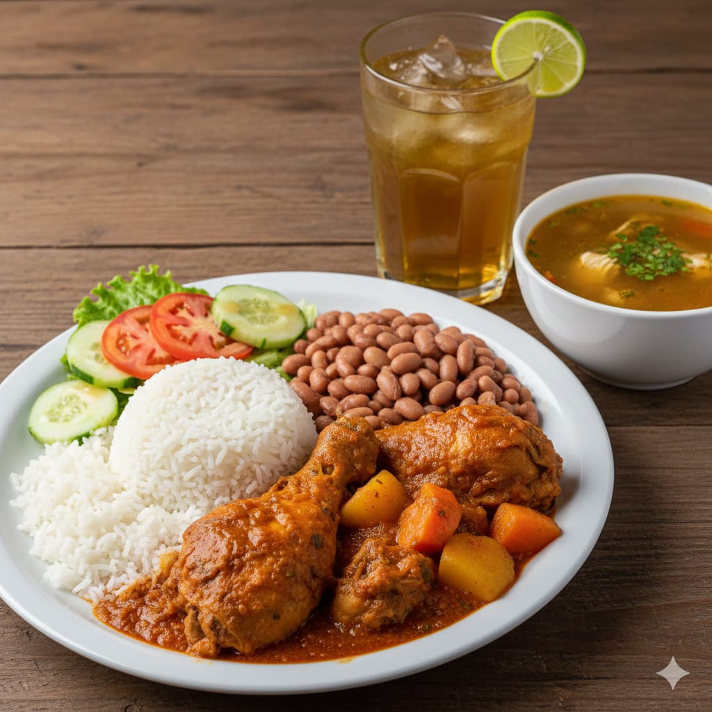 acompañado de arroz granos tajadas ensalada sopa y Guarapo