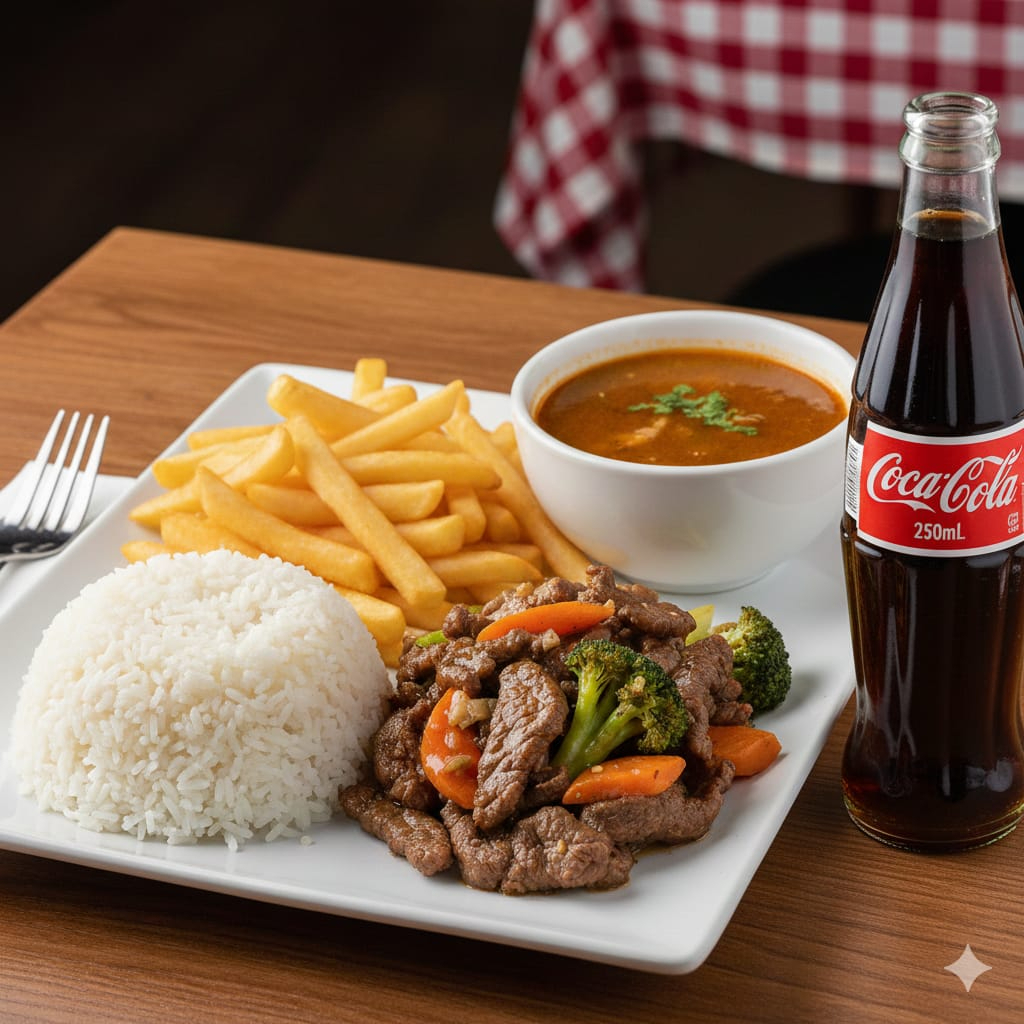 arroz+papas francesas+sopa+carne con vegetales+gaseosa250ml