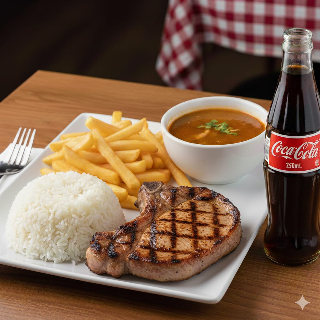 arroz+cerdo a la plancha+papas fritas+sopa+gaseosa 250 ml