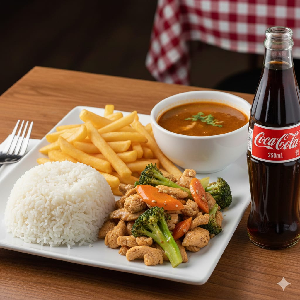 arroz+ pollo con vegetales+papas fritas+sopa+gaseosa 250ml