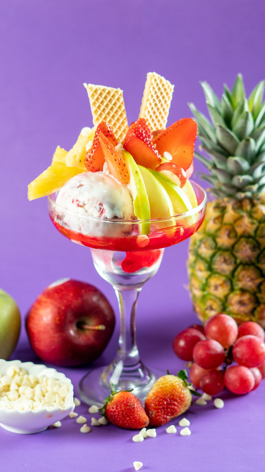Helado (2), fresa, manzana roja, uva roja, cereza, arandanos, chantilly, salsa, chip de chocolate blanco, galleta wafer.