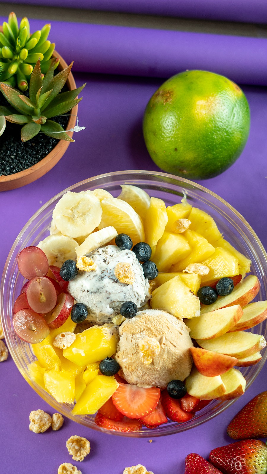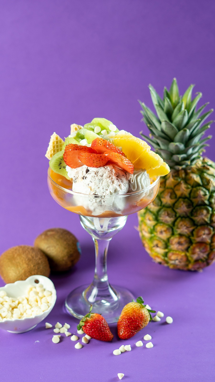 Helado (2), fresa, kiwi, piña, banano, cereza, chantilly, salsa, chip de chocolate blanco, galleta wafer.