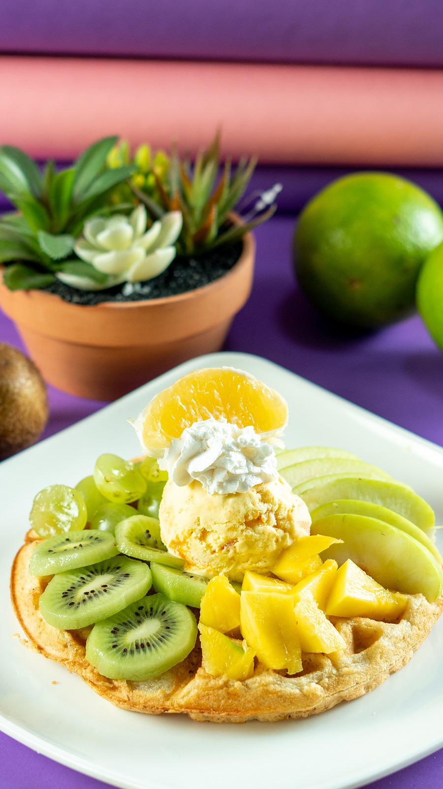 Waffle , helado(1), kiwi, manzana verde, uva verde, mango, mandarina o naranja, salsa, chantilly, galleta waffer, chip de chocolate blanco, queso.