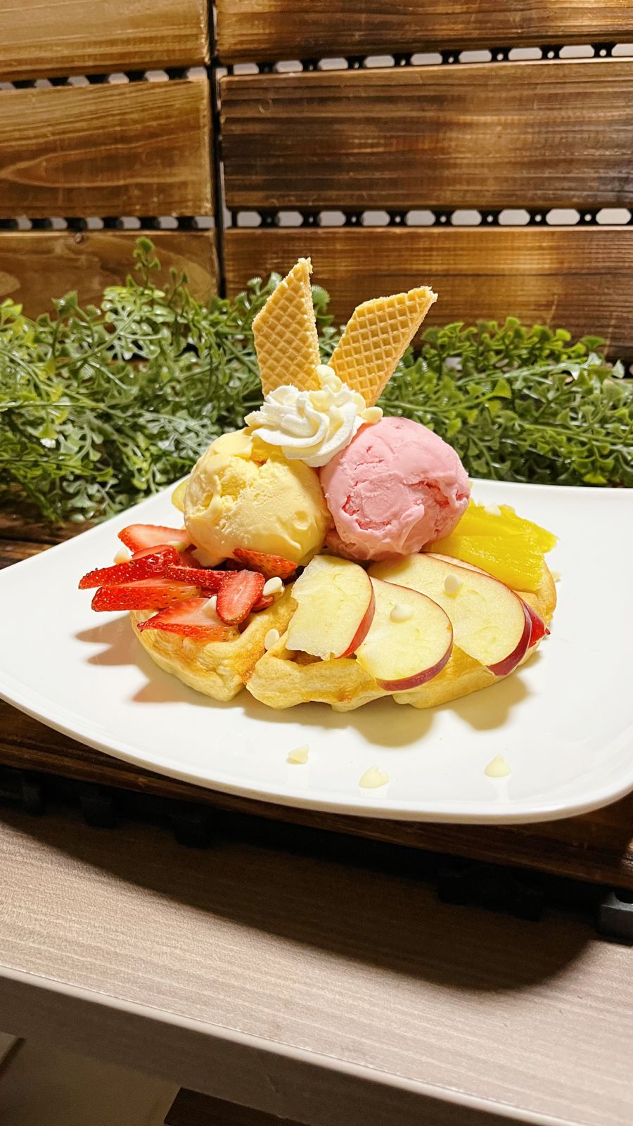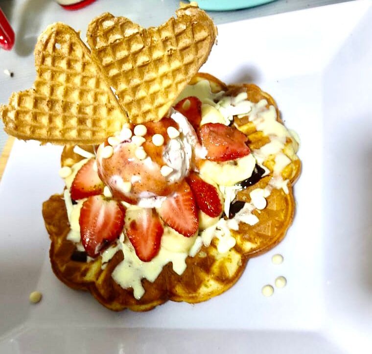 Waffle , helado(1), manzana verde, manzana roja, fresa, piña, uvas roja, queso, salsa, chantilly, chip de chocolate blanco, galleta waffer.