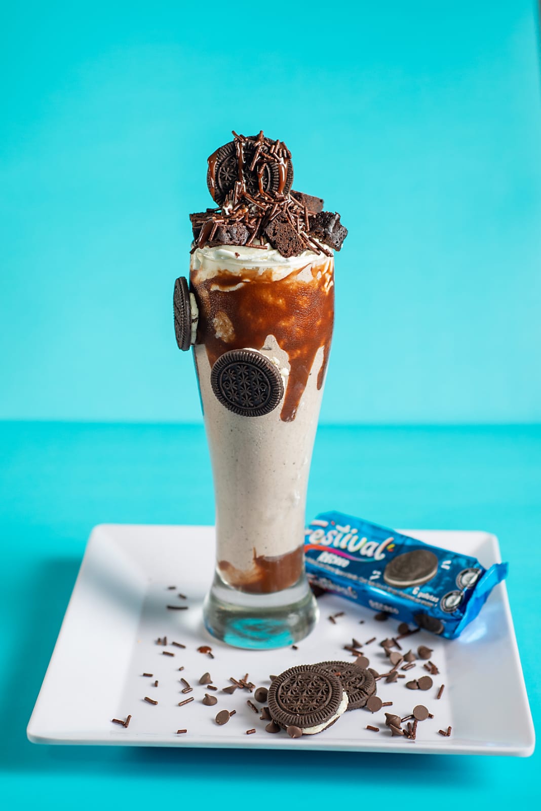 4 galletas oreo, helado (3), Chantilly, Oreo Triturado, lluvia de chocolate, salsas