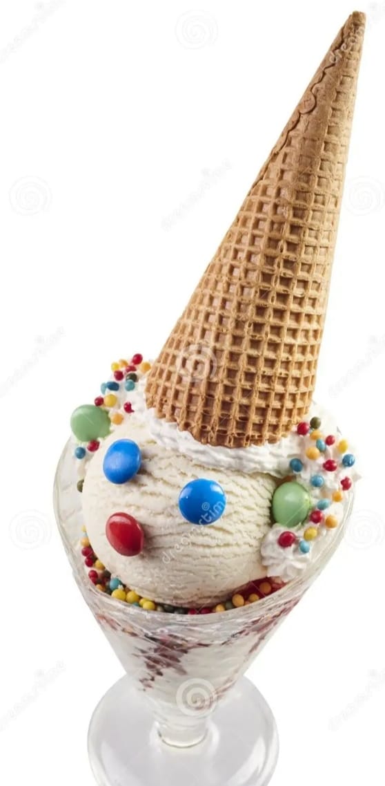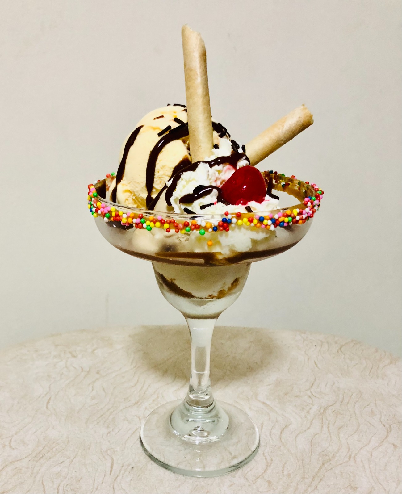 Helado (3), chantilly, cereza, salsa, chip de chocolate de colores, galleta wafer.