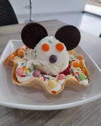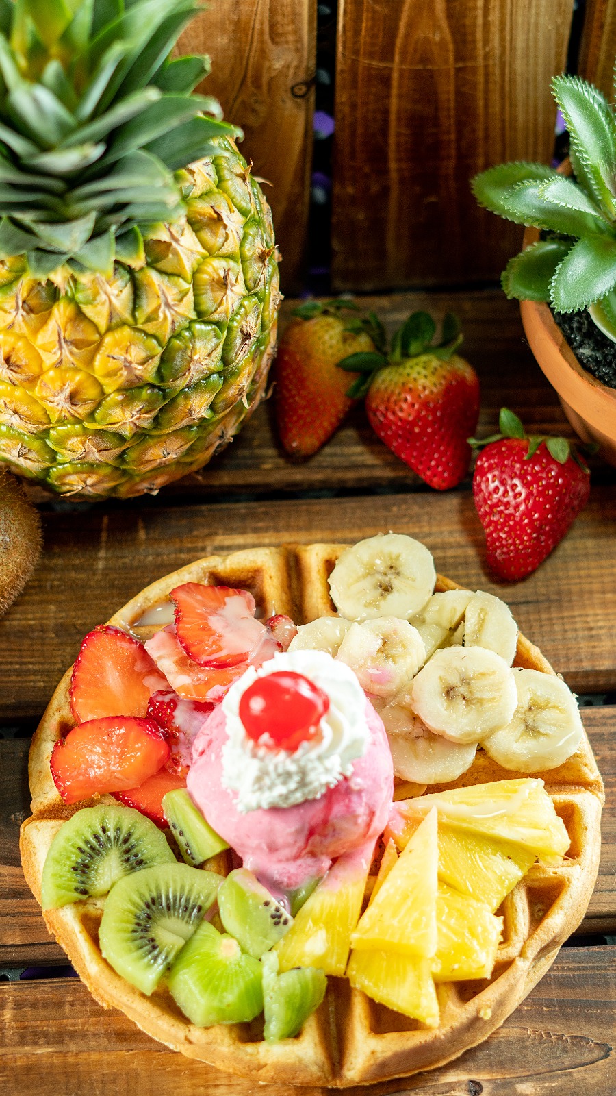 Waffle , helado(1), kiwi, piña, banano, cereza, fresa, chantilly, queso, salsa, chip de chocolate blanco, galleta waffer.
