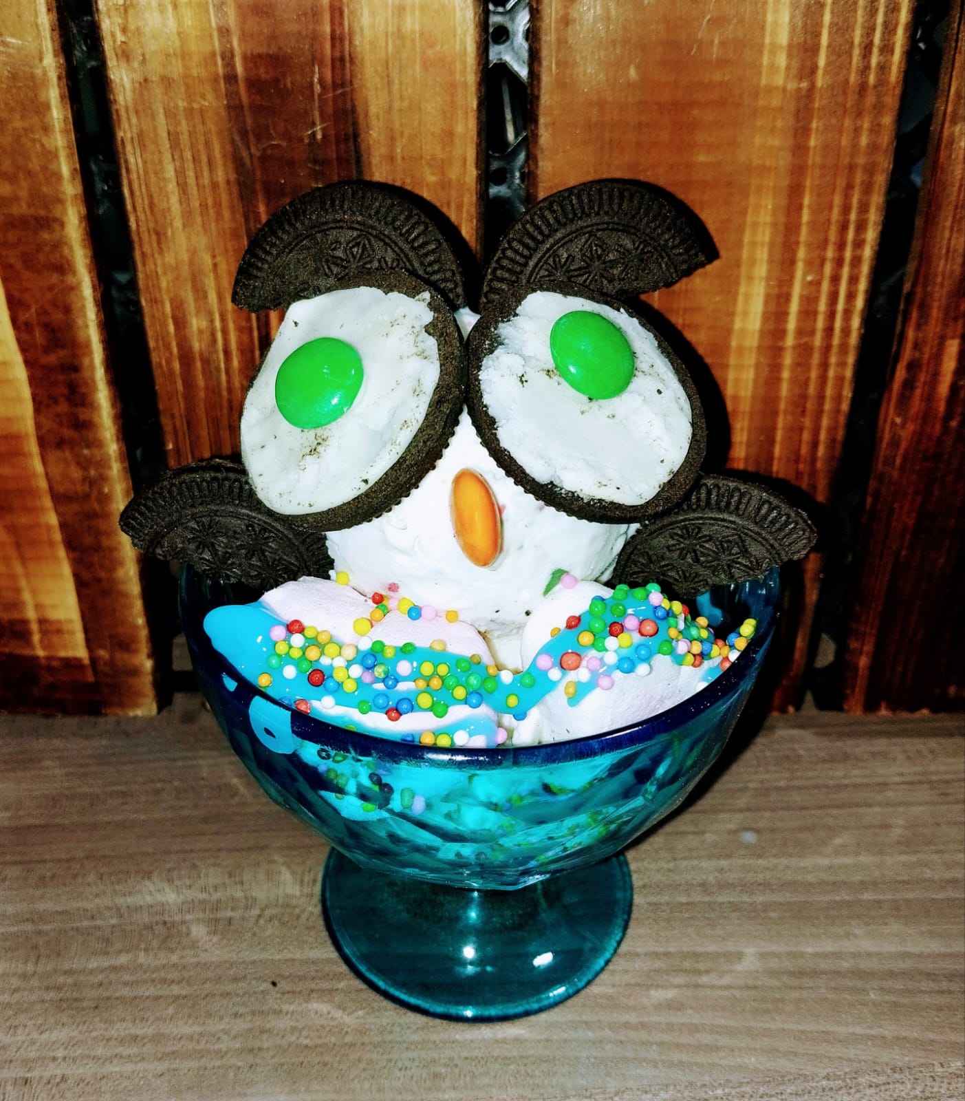 Helado (2), galleta oreo, masmelo, salsas, chip chocolate de colores.