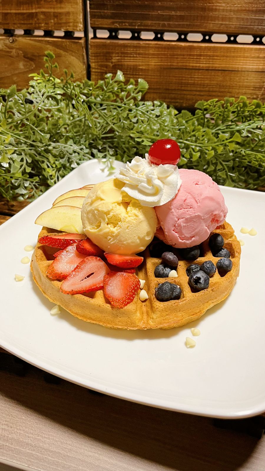 Waffle, helado(1), fresa, manzana roja, uva roja, arandanos, cereza, salsa, chantilly, chip de chocolate blanco, galleta waffer, queso.