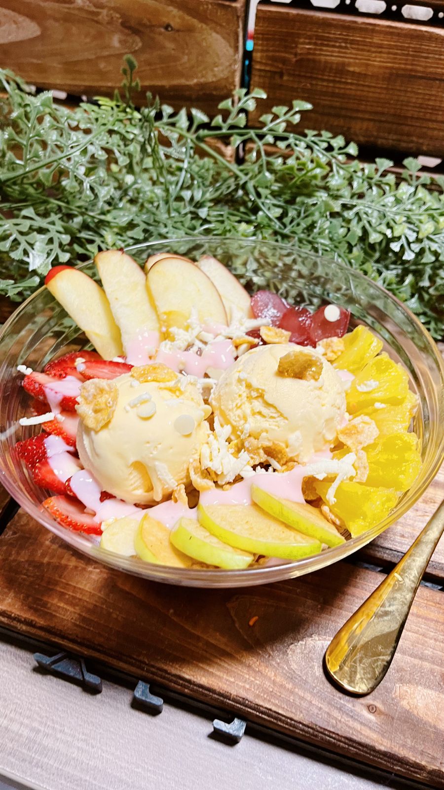 Helado (2), manzana roja, manzana verde, fresa, piña, uva roja, arandanos chantilly, salsa, chip de chocolate blanco, galleta wafer.
