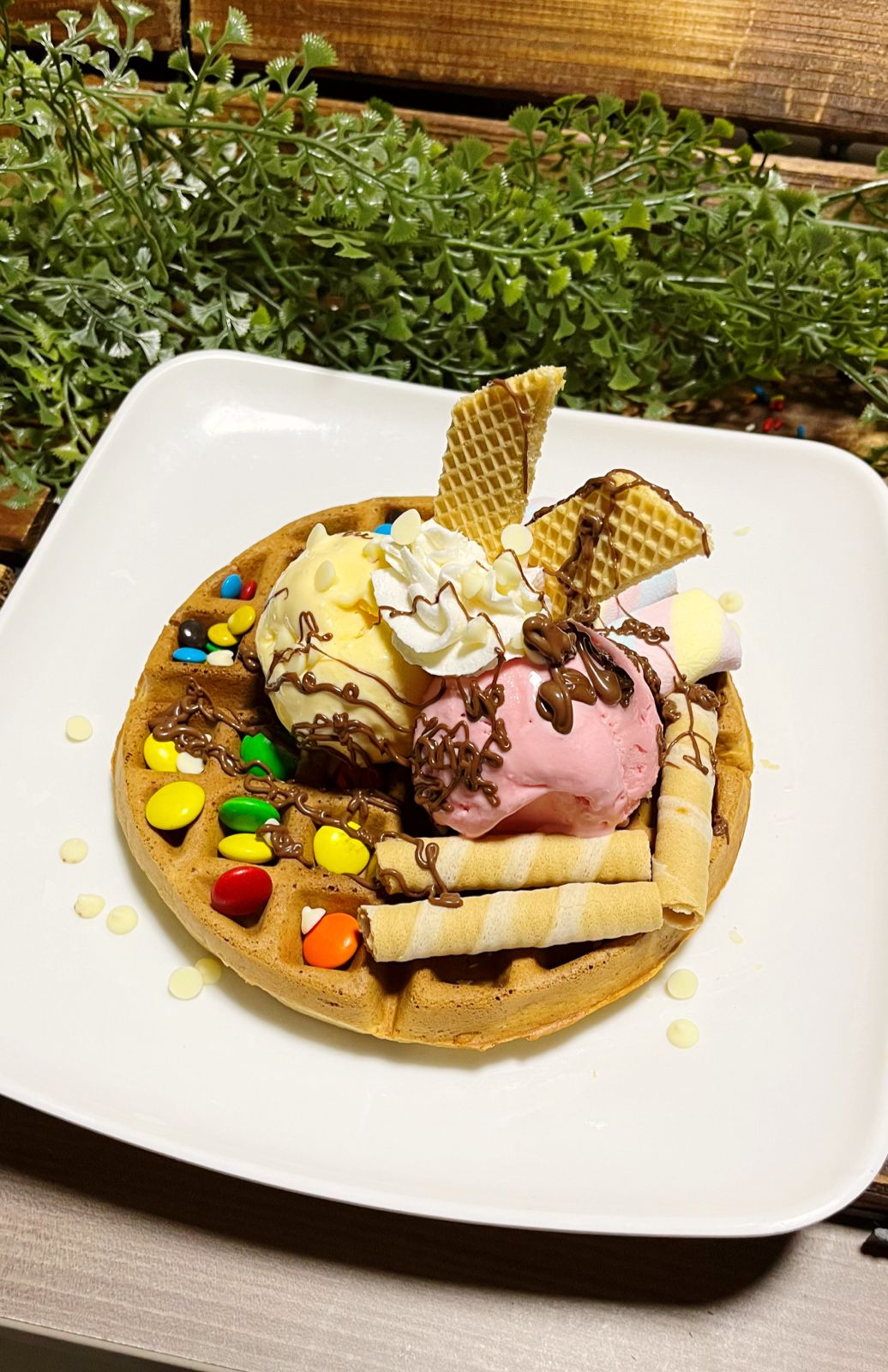 Waffle , helado (1), arequipe, crema avellana, salsa, m&m, piazza, masmelo, galleta oreo, chantilly, galleta waffer.