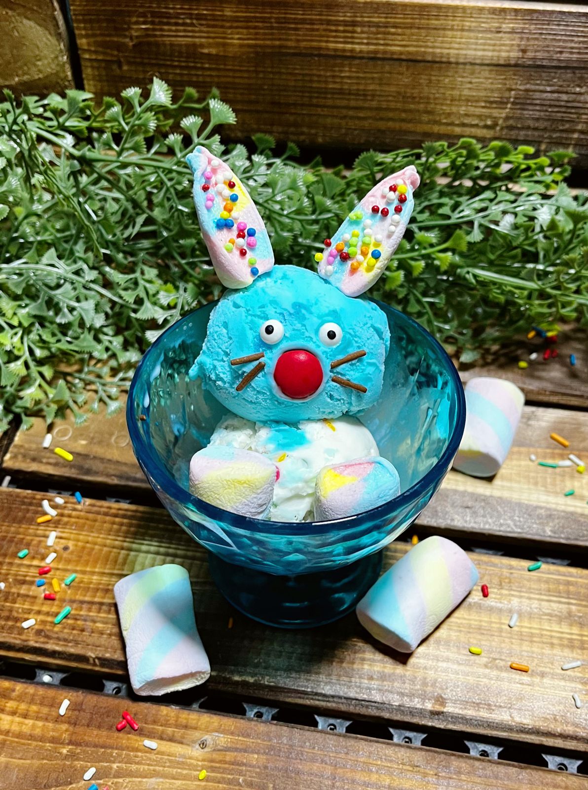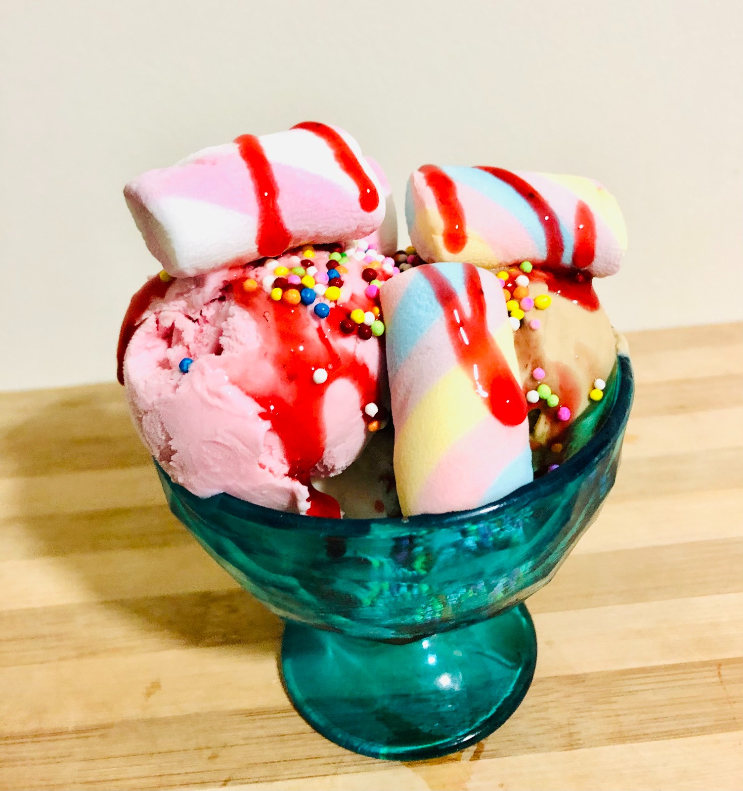 Helado (2) masmelos, chantilly, chip chocolate de colores, salsa, galleta wafer.