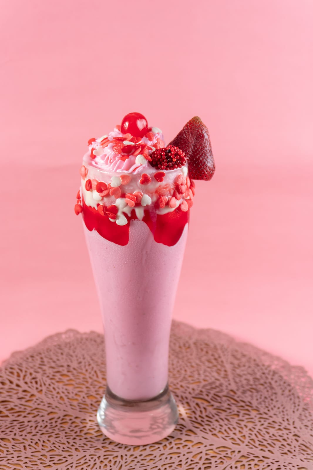 Fresa, helado (1), crema chantilly, crema de la casa, chip de chocolate blanco, galleta wafer.