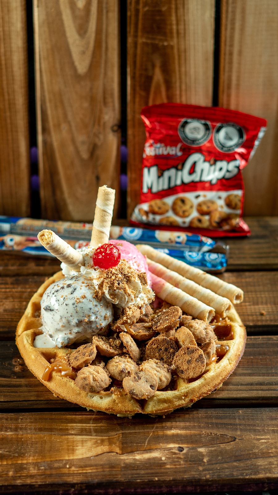 Waffle , helado(1), galleta minichips, galleta oreo, piazza, chantilly, arequipe, salsa, chip de chocolate blanco, galleta waffer, cereza.