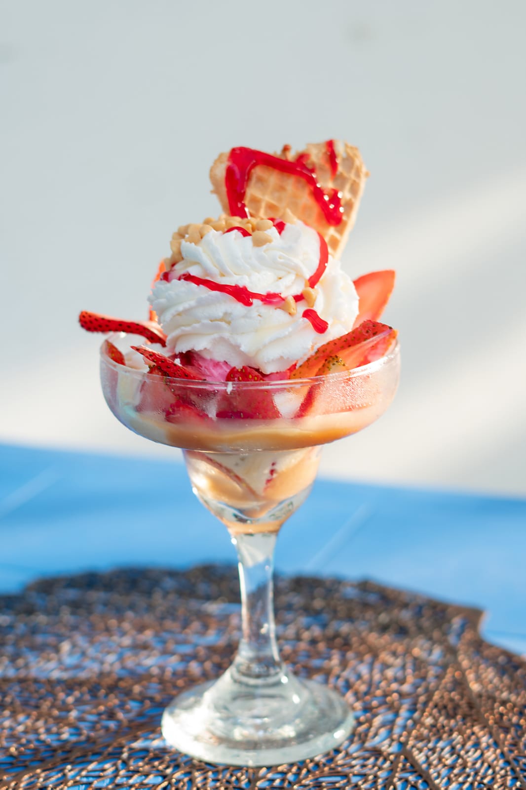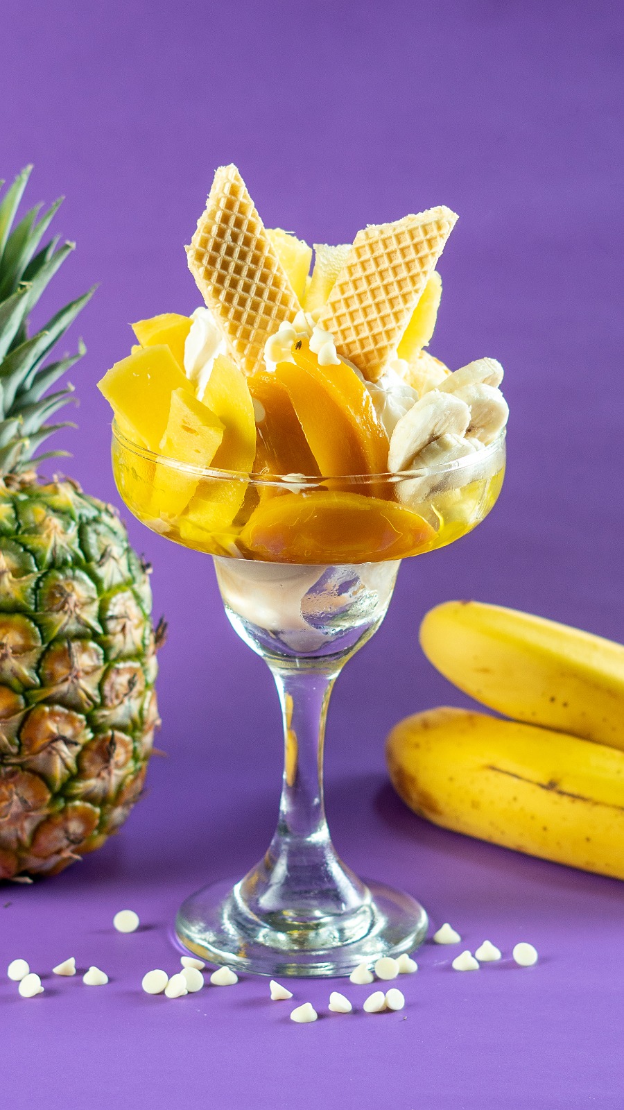 Helado (2), durazno, mango, piña, banano, chantilly, salsa, chip de chocolate blanco, galleta wafer.