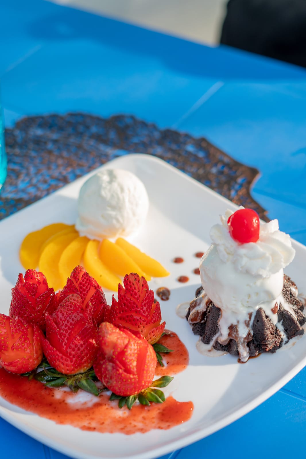 Plato para dos: helado (2), fresas, cereza, brownie (1), nutella, crema chantilly, crema de la casa.