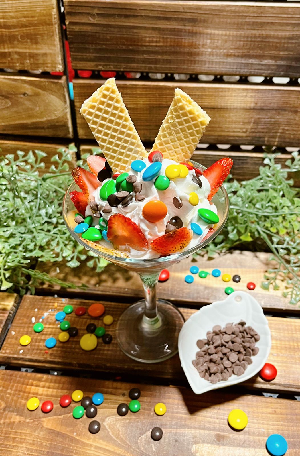 M&M, Helado (3), chantilly, mini M&M, salsas galleta