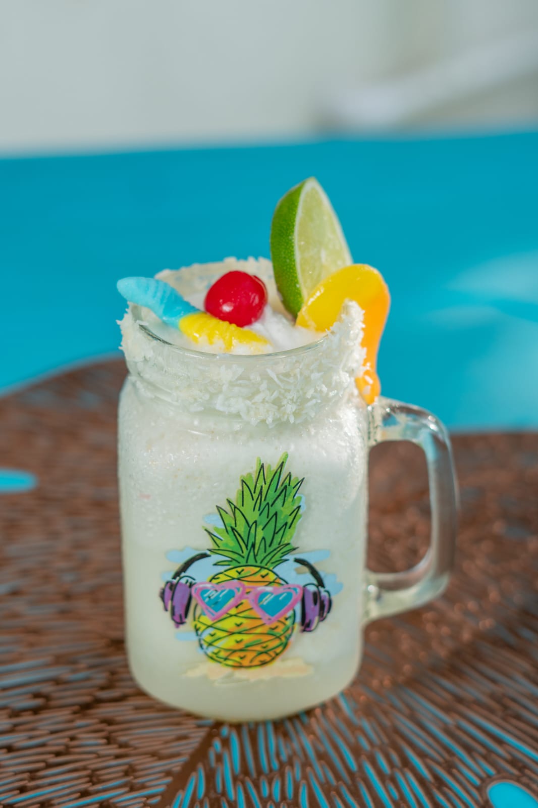 piña, chantilly, salsa, galleta wafer, chips de chocolate blanco.