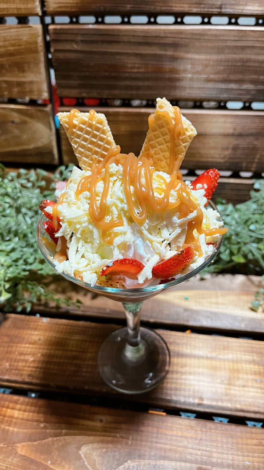 Fresa, helado (1), queso, crema de la casa, galleta wafer.
