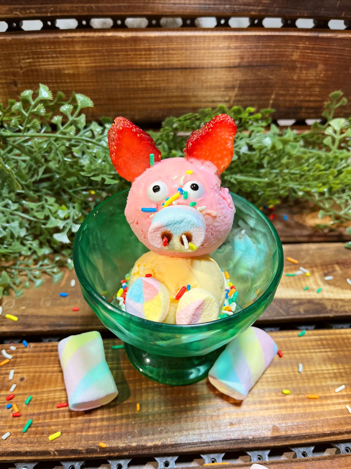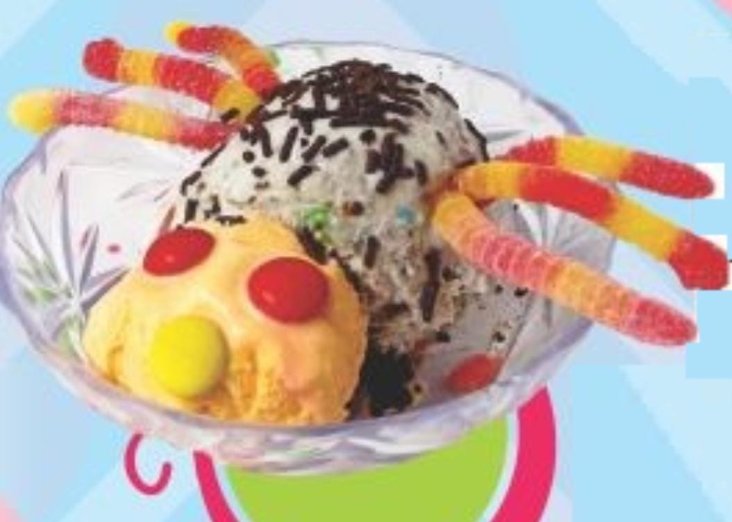 Helado (2), gusanitos, masmelo, salsas, chip chocolate de colores.