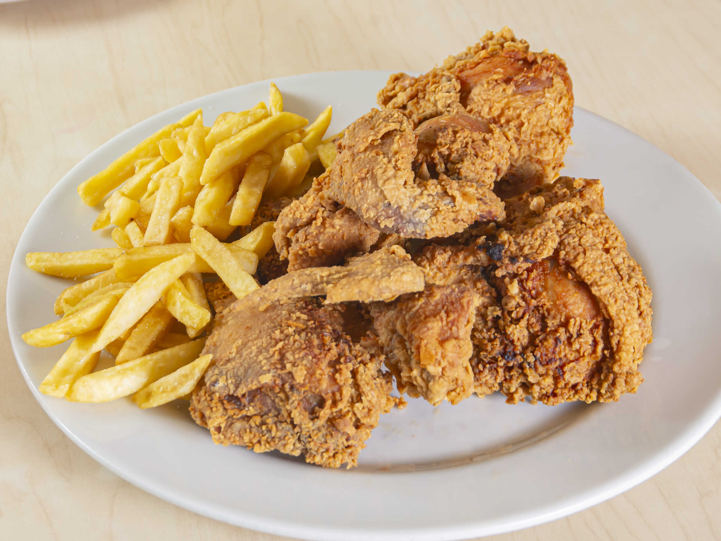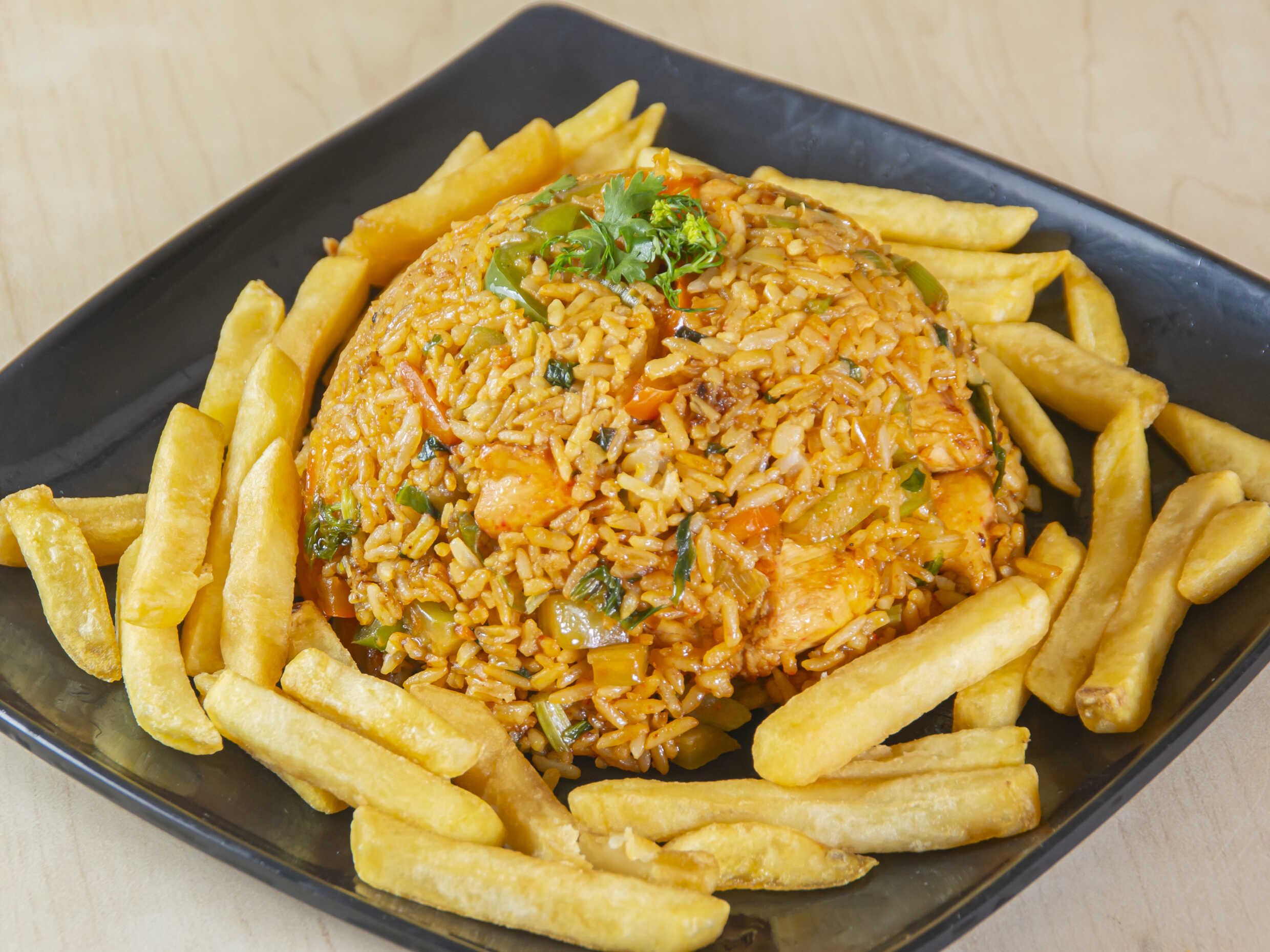 Arroz con pollo tamaño familiar, más 300 g papas a la francesa.