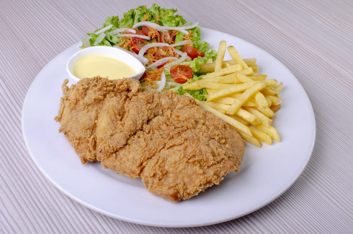 Filete de pechuga de 200 g (asado o apanado), porción de papas a la francesa, ensalada fresca.