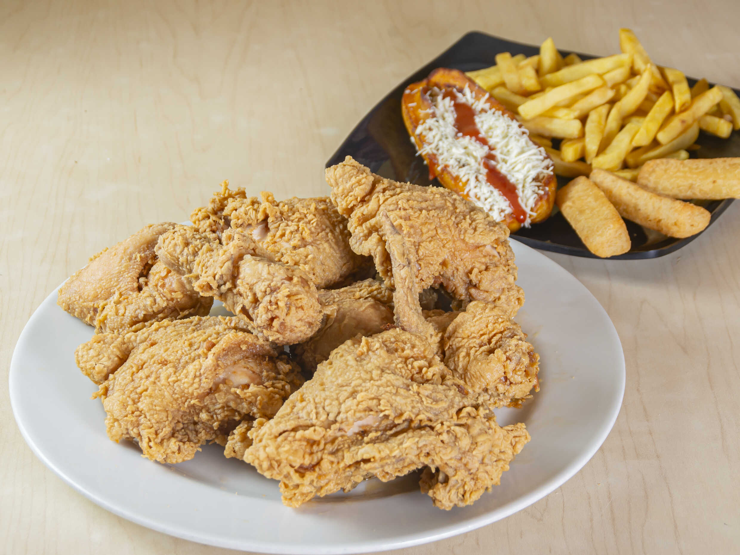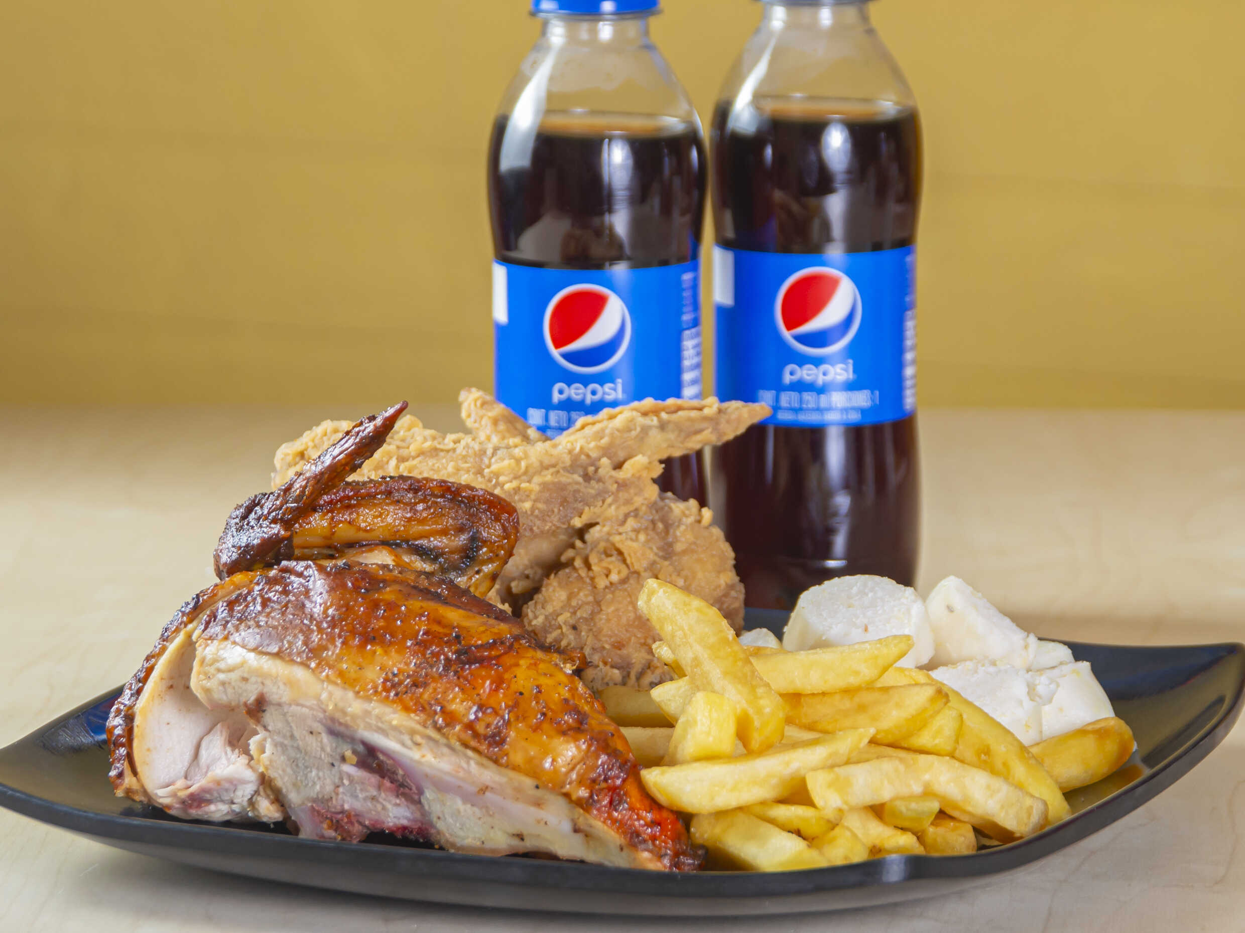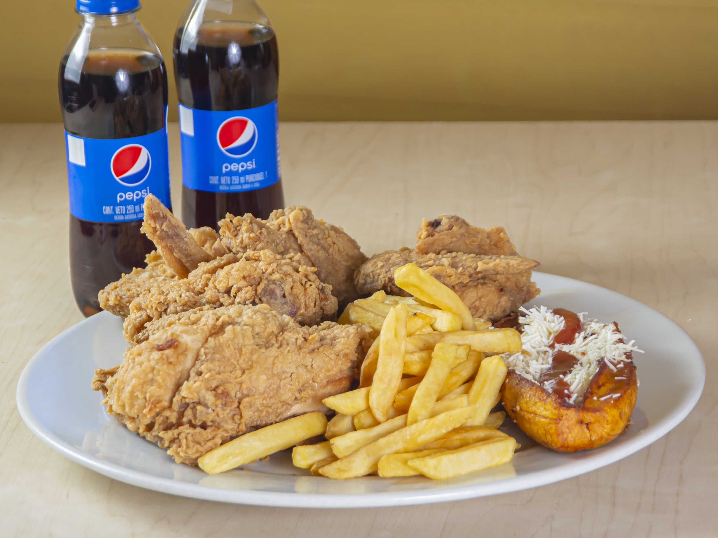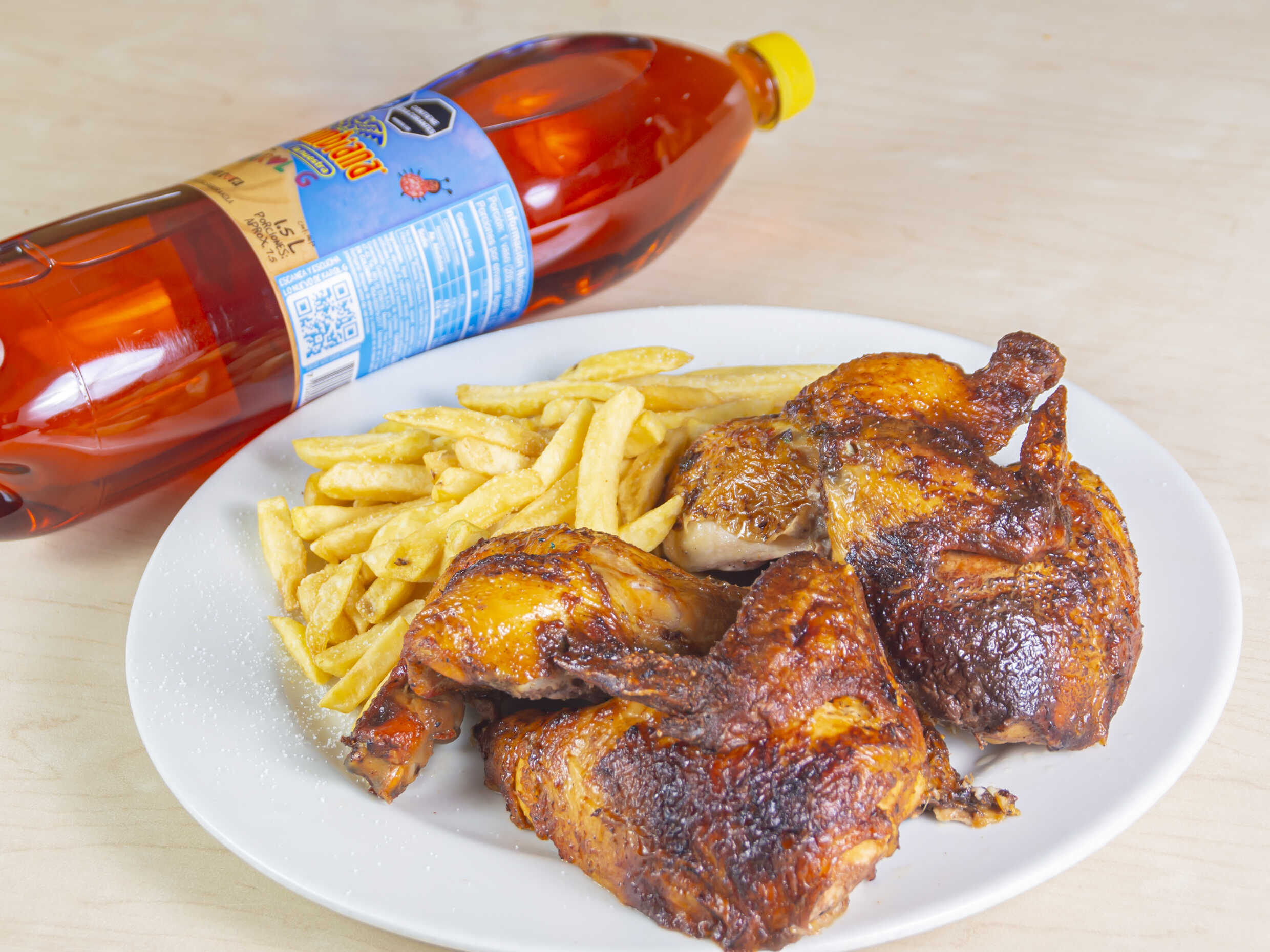 Medio pollo broaster o asado, 4 alitas apanadas, un plátano maduro con queso y bocadillo, 100 g de papas a la francesa, 2 gaseosa pet 250 ml.
