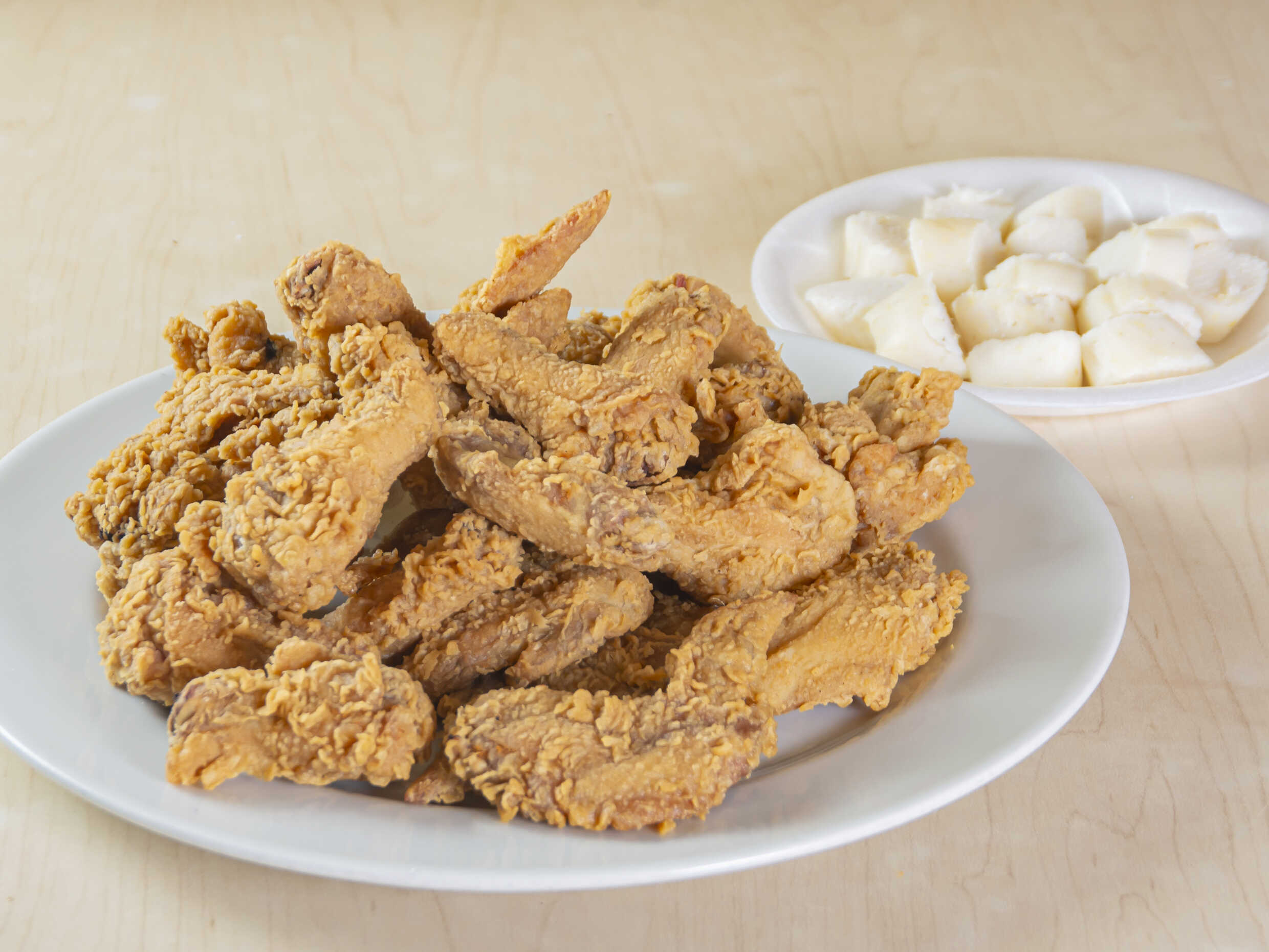 24 Unidades de alitas apanadas, más 2 bollos limpios.