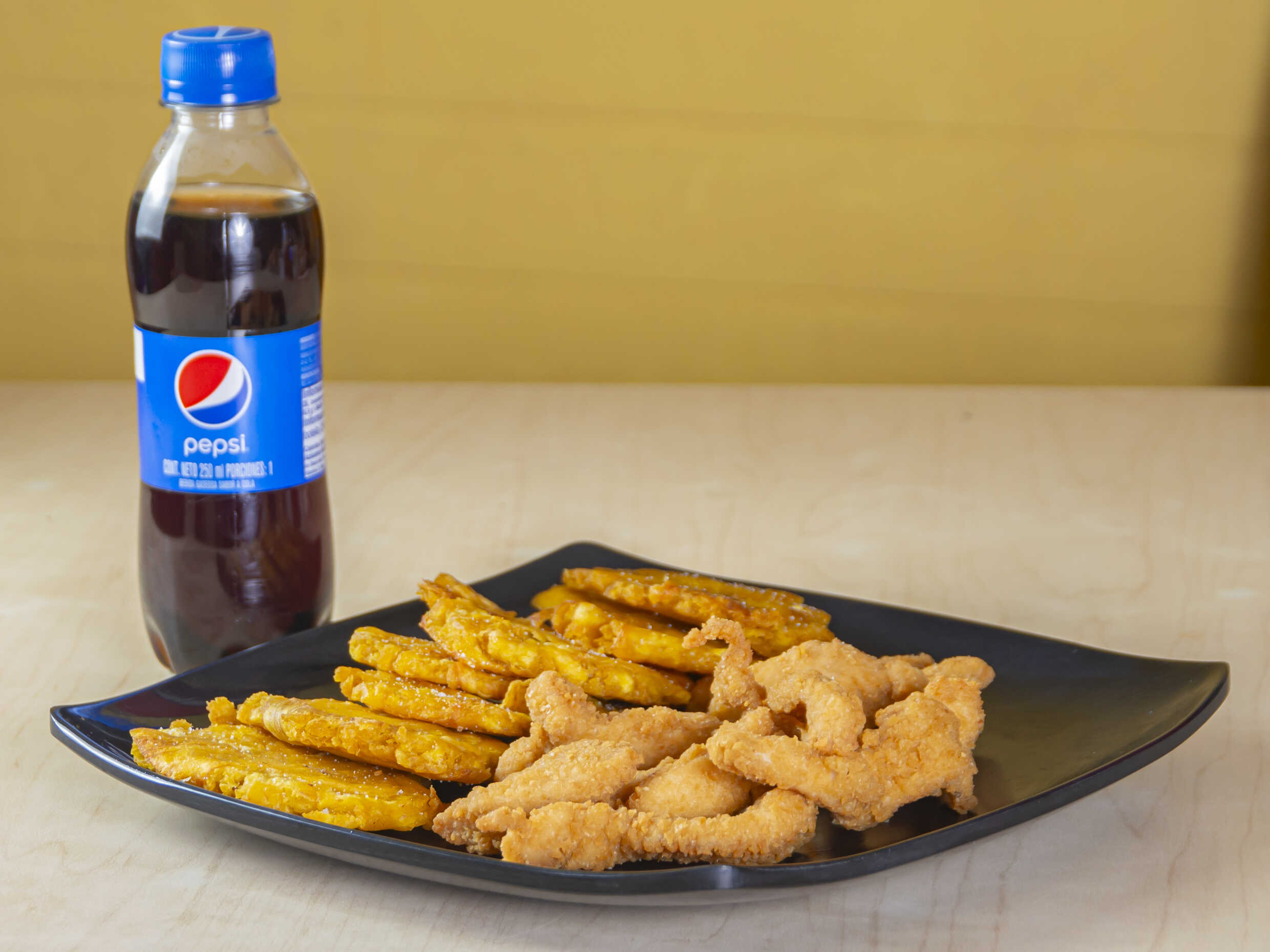 Lomitos de pechuga apanados, 8 patacones, más gaseosas 12 oz.