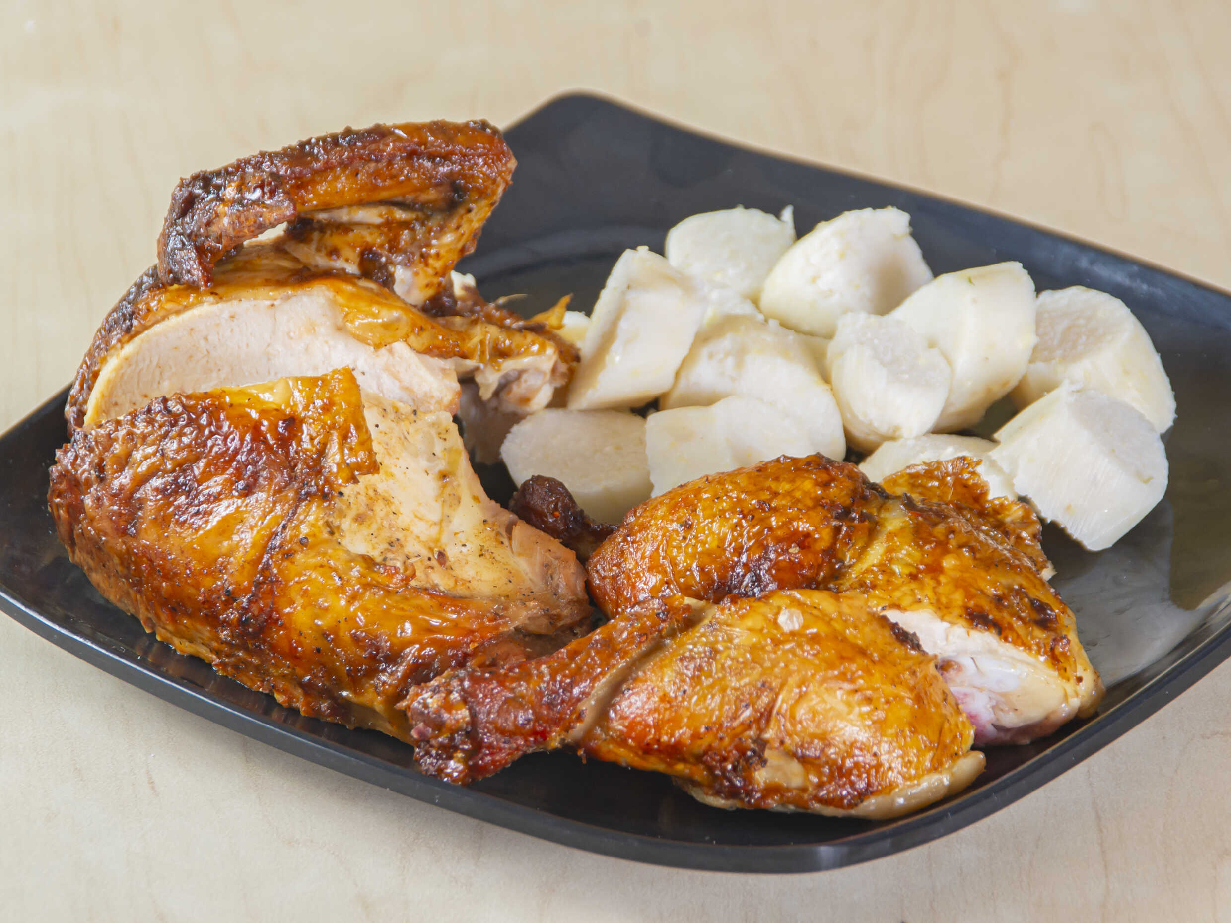 Pollo asado con 2 bollos (2 presas según disponibilidad).GRATIS MADURO CON QUESO Y BOCADILLO