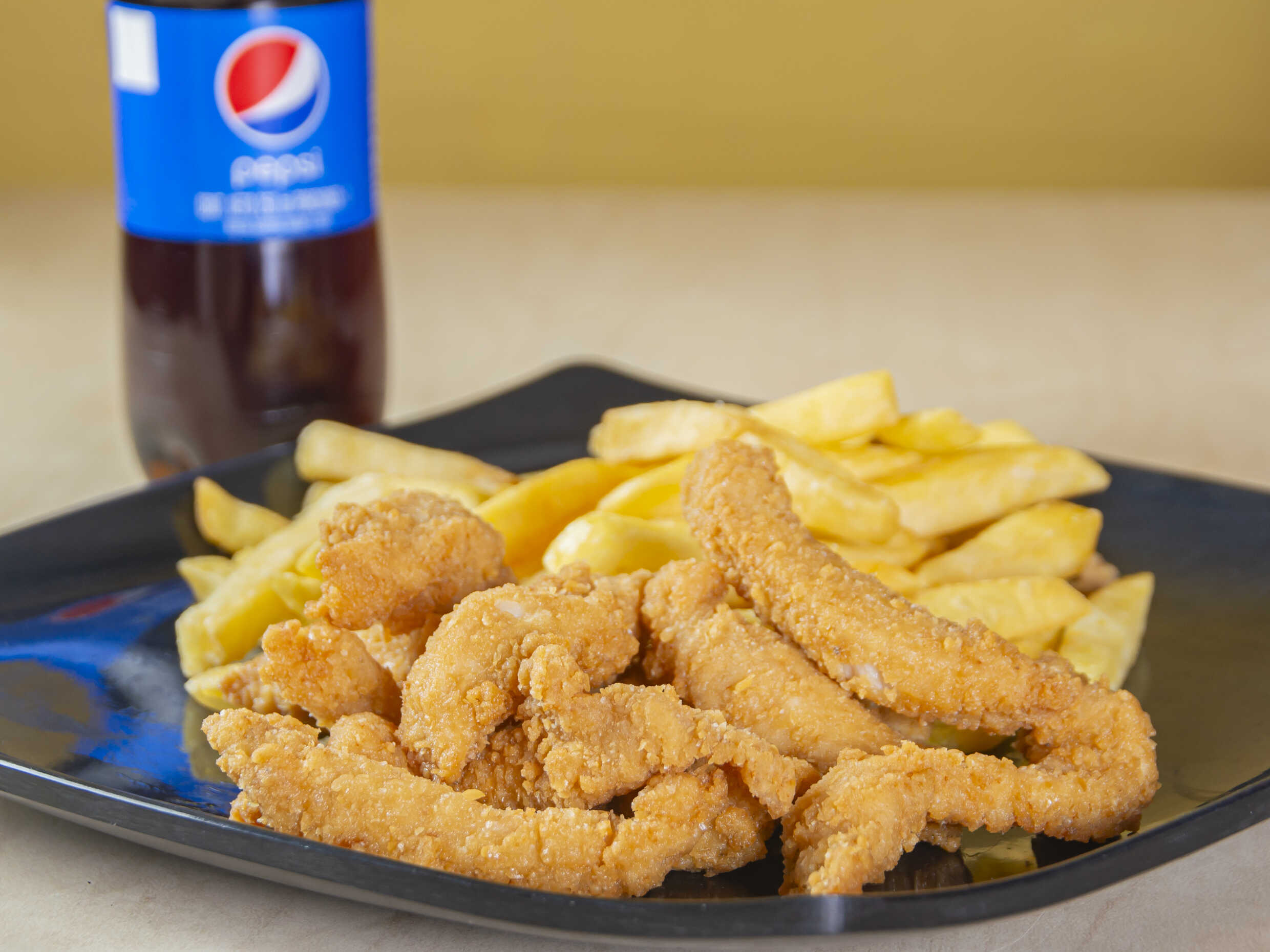 Lomitos de pechuga apanados, 150 g papas a la francesa, más gaseosa pet 250 ml.