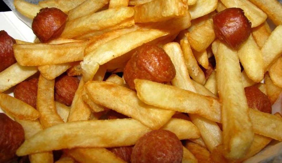 Salchipapa sencilla con papa a la francesa, salchicha, queso costeño, lechuga y salsa de la casa.