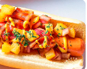 Pan, salchicha suiza, tocineta, trocitos de piña, jamón, lechuga, papa chongo y salsa de la casa.