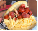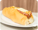 Pan, salchicha, papa chongo, lechuga, queso y salsa de la casa.