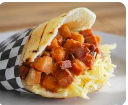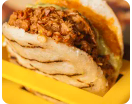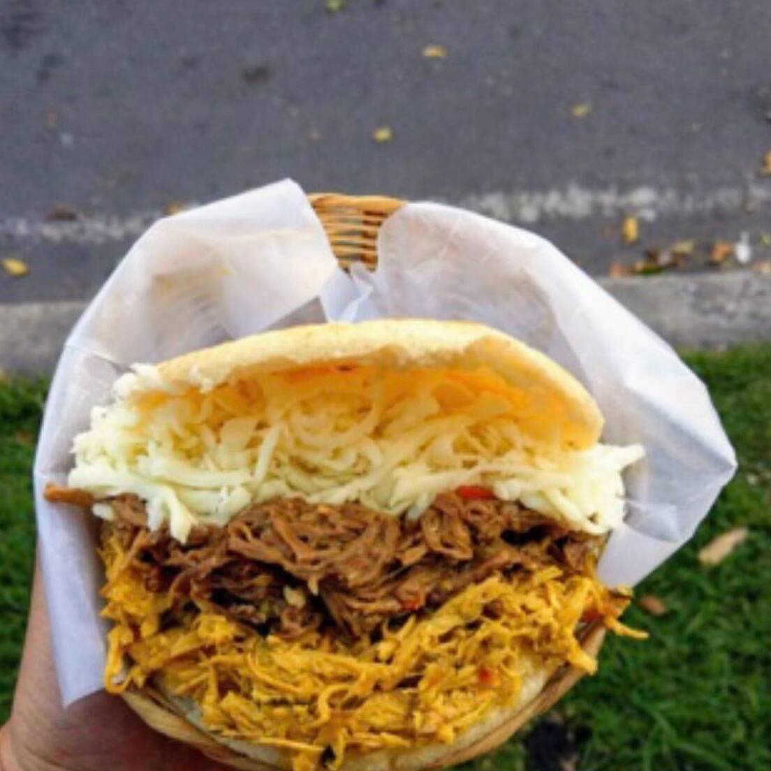 Arepa de maíz, rellena de pollo desmechada, carne desmechada, queso, salsa de la casa, se puede añadir las siguientes proteínas, pollo, carne, butifarra, chorizo.