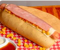 Pan, salchicha, piña en trocitos, jamón, lechuga, papa chongo, queso y salsa de la casa.