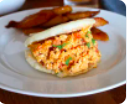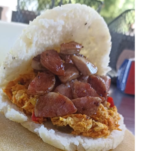 Arepa de maíz asada, rellena de revoltillo de huevo con cebolla, tomate, tajada de maduro, queso, se puede añadir las siguientes proteínas, pollo, carne, butifarra, chorizo.