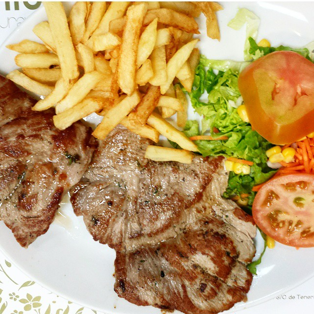 Pechuga 200 g, carne 200 g, papa a la francesa, ensalada y salsa de la casa.