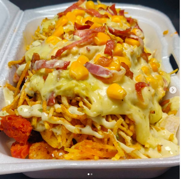 Papas a la francesa, salchicha, salsa tartara, queso costeño, papa chongo, queso mozarella y maiz.
