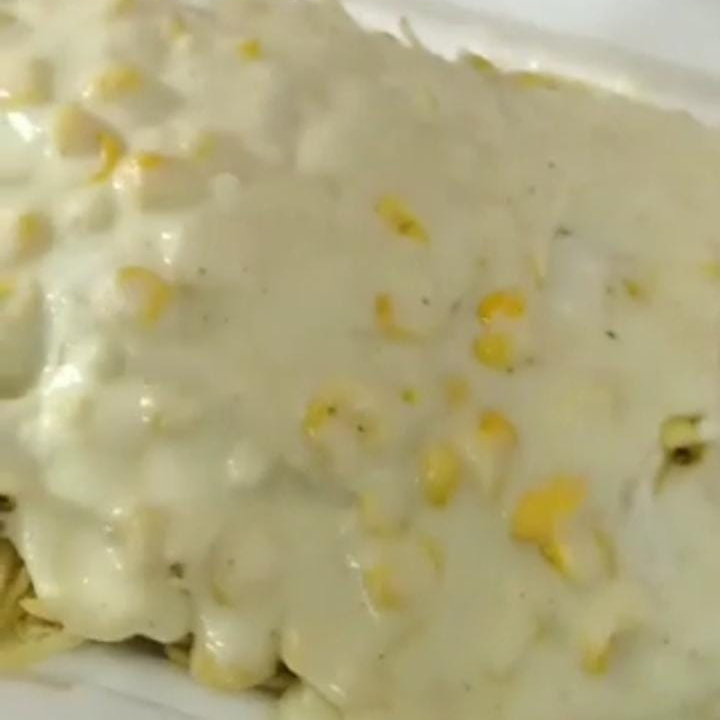 Arepa rellena con salchicha ranchera, pollo, maíz y queso.